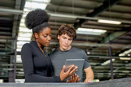Trainerin erklärt einem Azubi etwas an einem Tablet.